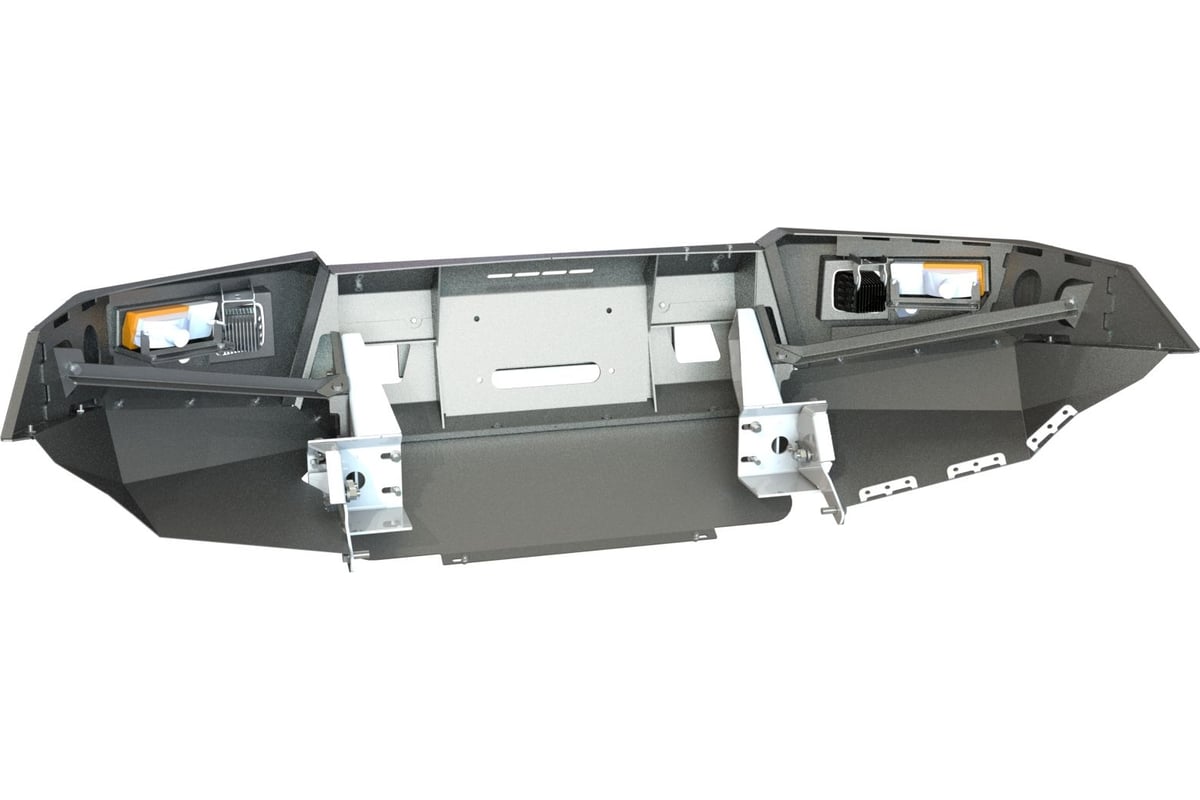 Бампер оснащен мощными упорами под реечный домкрат и буксирными проушинами для работы с рывковой или буксировочной стропой.