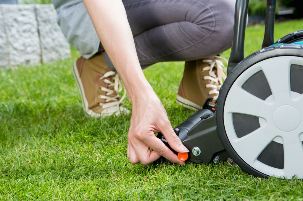 Регулировка высоты кошения это верх удобства. Рукой оттягивается в сторону подпружинненый упорный штифт, а второй рукой косилка двигается за ухо вверх или вниз, выставляя высоту кошения по встроенной шкале. Со второй стороны производится такая же манипуляция. 10 секунд на каждую сторону. Имеется 4 положения высоты кошения, 12, 22, 32, 42 мм.