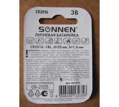 SONNEN Lithium, CR2016 покупал в апреле 2026г за 33руб, на сколько хватит заряда время покажет, использовал для установки в наручные часы.