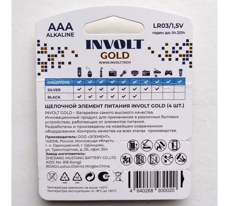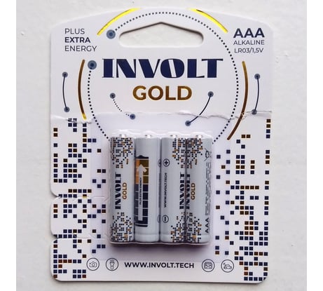 Серия Gold в модельной линейке батареек INVOLT позиционируется изготовителем как самая энергоёмкая. По результатам независимых испытаний BatteryTest, эти батарейки заняли 2-е место среди более чем 130 их аналогов формата Alkaline LR03. Изделия аккуратно выполнены, имеют красивый нарядный дизайн. Полная длина батарейки 44.3 мм, диаметр 14.0 мм, вес 12 г. Срок годности до 04.2034 Отдельный плюс -- за аккуратную и продуманную упаковку со специальным язычком для удобного вскрытия (на фото № 2 -- внизу справа).
