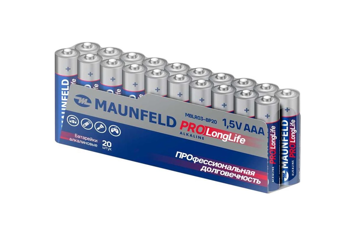 Батарейки MAUNFELD Pro Long Life Alkaline AAA(LR03), упаковка 20 штук - это надежные и долговечные батарейки, которые обеспечивают длительное время работы ваших устройств. Они имеют высокую емкость 1200 мА·ч и рабочее напряжение 1,5 В, что позволяет им работать дольше, чем другие батарейки.