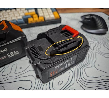 Аккумулятор не тот, что на фото. Купил аккумулятор на 5Ач для лопаты DAEWOO с акб и зу DAST 3321Li SET. Читал что не подходит, но конкретики не было. Да, он не подошел из-за чуть измененного паза. Чуть доработал (на фото), и аккумулятор встал на место и лопата запустилась. Встал не до щелчка, но и это можно доработать. Но он хорошо держится. По емкости пока не скажу, надо тестировать вместе с комплектным. Если держит меньше, то отзыв дополню. По весу он чуть легче, что подозрительно. Работает как повербанк, это плюс. Но ток зарядки небольшой (какой не знаю, но заряжает медленно)