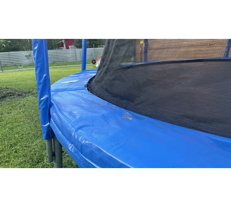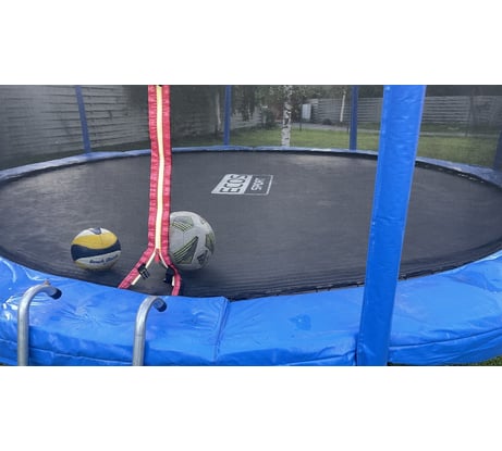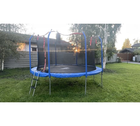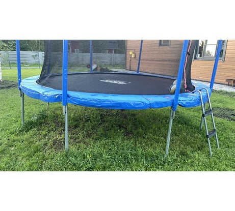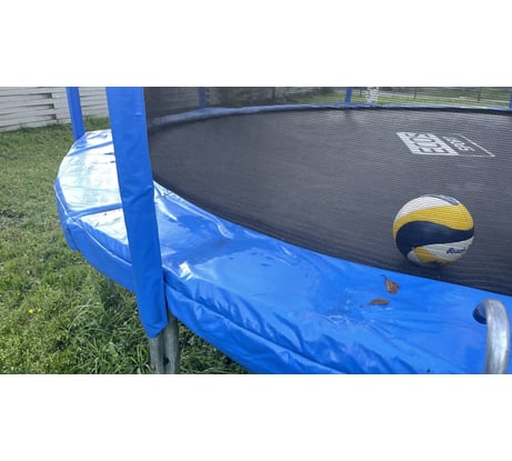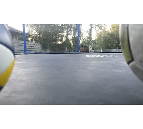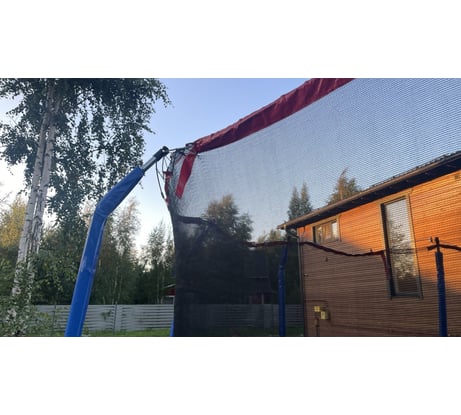 хороший батут. пишу спустя год эксплуатации. реально можно даже вчетвером прыгать. можно с мячём внутри в пятнашки играть. места много.собирается дастаточно просто. лучше вдвоём, чтобы быстрее. в первый год начал скрипеть чере пару недель, достаточно сильно чтобы раздражать. как и куда только не смазывал, от скрипа не избавиться. на зиму убирали в дом. весной решил перед сборкой все трущиеся части смазать смазкой типа литола, включая пружины. в итоге сейчас вообще скрипа нет, очень хорошо. сама поверхность, на которой прыгаешь качественная, следов эксплуатации через год нет. чего не скажешь о креплении сетки сверху, всё порвалось, видно на фото. местами обмотали дополнительно бечёвкой. батут закрепили к земле четырмя скобами из арматуры, чтобы жёстко стоял. втулки крепления с резьбой для верхних направляющих в сетке не очень качественные, но в принципе терпимо. всё видно на фото. если внешний вид обмотки сетки сверху не смущает, то всё отлично, рекомендую.
