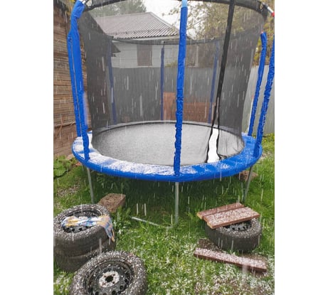Хороший надёжный батут. Два сезона, дети в восторге, оптимальный размер для двоих, суммарный вес детей не превышает паспортный. На зиму убираем. Металл каркаса толстый и прочный. Молния не расходится и хорошо держит, в ней были сомнения так как пластиковая, но на удивление прочная. Расслоилась одна стекловолоконная дуга с верху, тоже решаемо, купил похожую на маркетплейсе. На фото батут после сильнейшего града.