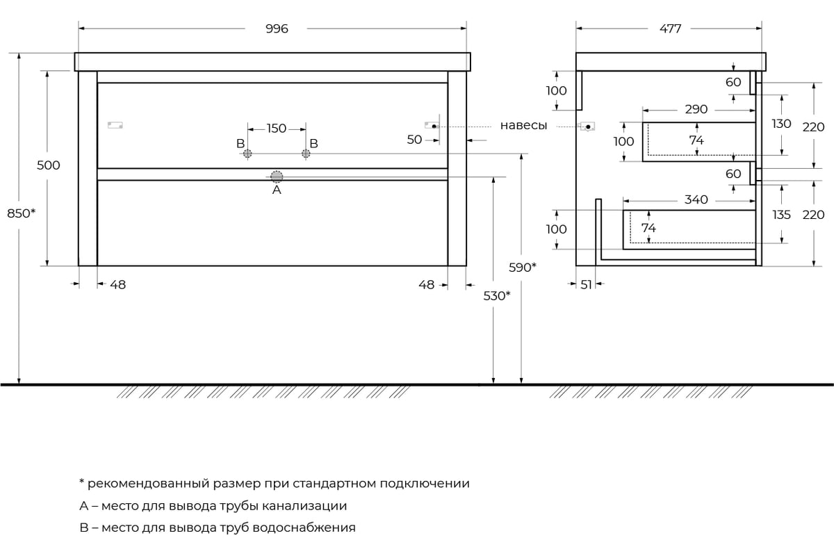 - RELAX База под раковину подвесная с двумя выкатными ящиками, Сатин, 996x478x500, RELAX-1000-2C-SO-SAT-P