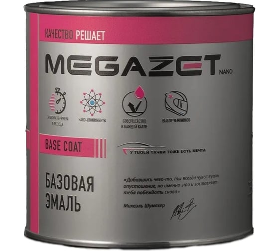 "Базовая эмаль MEGAZET – высококачественная однокомпонентная краска для авто, типа «база под лак». В её производстве используются стабильные рецептуры и продукты на основе нано-компонентов. Благодаря передовым разработкам, продукция MEGAZET имеет повышенный срок хранения.