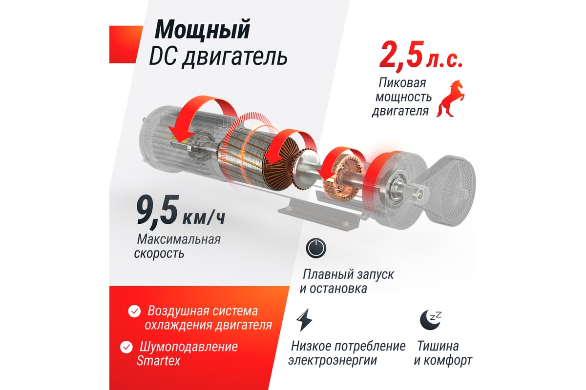 Уникальная конструкция без поручней обеспечивает полную свободу движений. Можете бегать, ходить или выполнять интервальные тренировки, не ограничивая себя в движениях. Благодаря мощному двигателю с пиковой мощностью 2,5 л.с., тренажер гарантирует надежность и высокую производительность дорожки даже во время интенсивных тренировок и разгоняет ее до 9,5 км/ч.