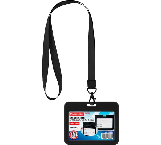 Бейдж горизонтальный BRAUBERG (54х85 мм), лента 45 см с карабином, комплект 10 шт., СЛАЙДЕР, черный, EXTRA 238834