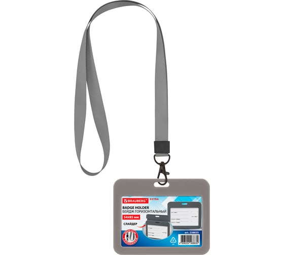 Бейдж горизонтальный BRAUBERG (54х85 мм), лента 45 см с карабином, комплект 10 шт., СЛАЙДЕР, серый, EXTRA 238835