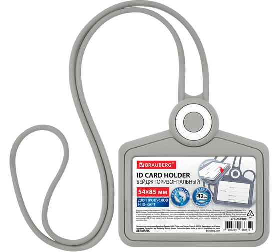 Бейдж горизонтальный для пропуска и ID-карт BRAUBERG СИЛИКОНОВЫЙ 54х85мм шнурок 42см серый 238909