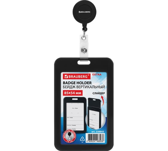 Вертикальный бейдж с рулеткой BRAUBERG для хранения тонких пропусков, карточек, ID-карт, проездных и банковских карт.