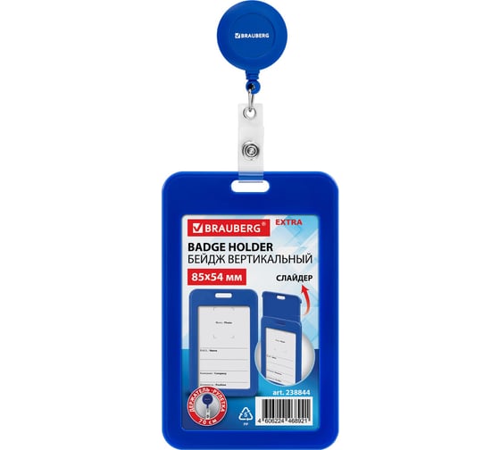 Бейдж вертикальный BRAUBERG EXTRA 85х54 мм, с рулеткой 70 см с клипом, 10 шт., слайдер, синий, 238844