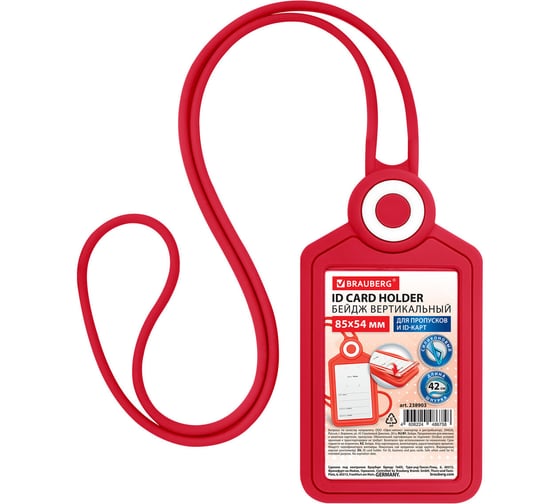 Бейдж вертикальный для пропуска и ID-карт BRAUBERG СИЛИКОНОВЫЙ 85х54 мм, шнурок 42см, красный, 238903
