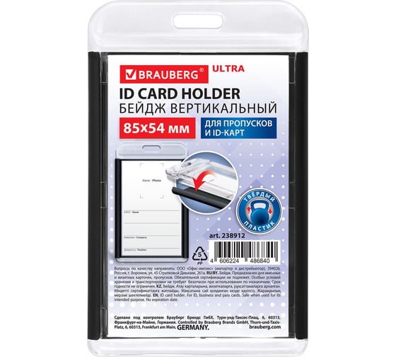 Вертикальный бейдж BRAUBERG ULTRA для хранения пропусков и карточек сотрудников, ID-карт, проездных и банковских карт.