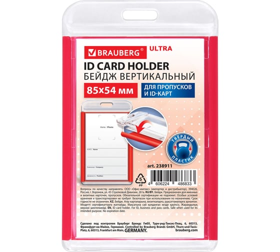 Бейдж вертикальный для пропуска и ID-карт BRAUBERG ULTRA 85х54 мм, красный 238911