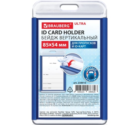 Бейдж вертикальный для пропуска и ID-карт BRAUBERG ULTRA 85х54 мм, синий, 238910