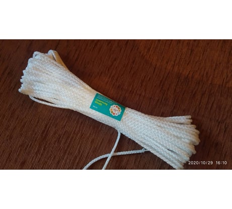 Хороший плотный шнур, достаточно крепкий. То, что и было нужно. Цвет чисто белый.
