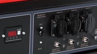 Контроль параметров Компактная панель управления бензиновой электростанции FUBAG MS5700 68231 содержит: переключатели включения генератора и защиты от перегрузок, ЖК-дисплей, три розетки 220 В/16 А. |