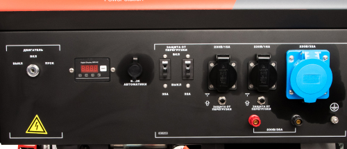 Для подключения на корпусе есть 3 розетки. Запуск осуществляется легко с помощью ручного или электростартера. Дополнительно можно подключить блок автоматики для ввода резерва без вашего участия. В электростанции установлен надежный профессиональный OHV-двигатель с экономичным расходом топлива и защитой от работы с низким уровнем масла.