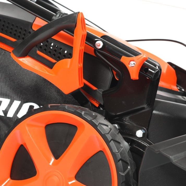 Компактность. Складная рукоятка и съемный травосборник позволяют легко транспортировать и хранить косилку.