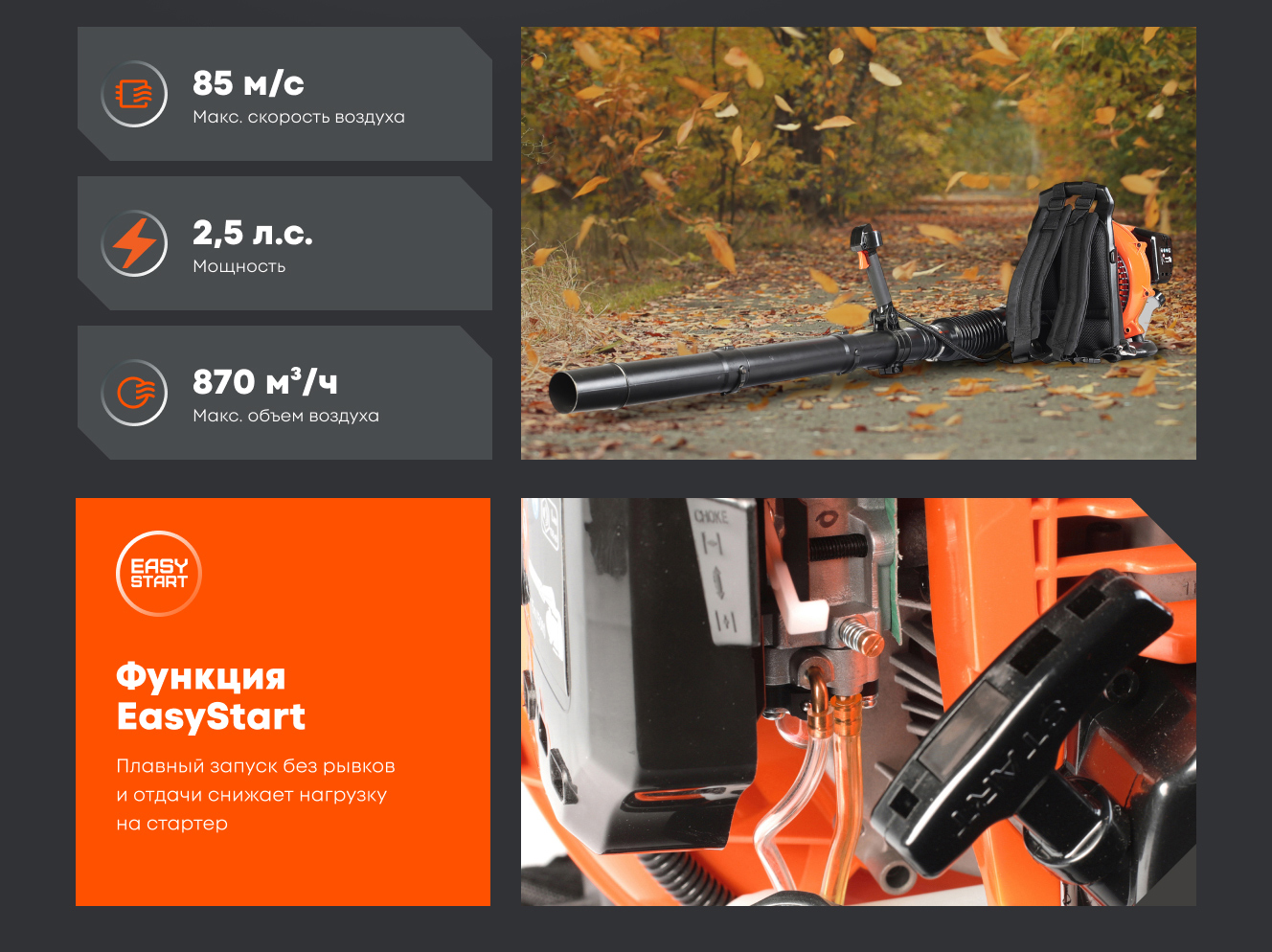 Эффективная работа. Благодаря двухтактному двигателю скорость воздушного потока достигает 60 м/с, что позволяет производить уборку эффективно и быстро.