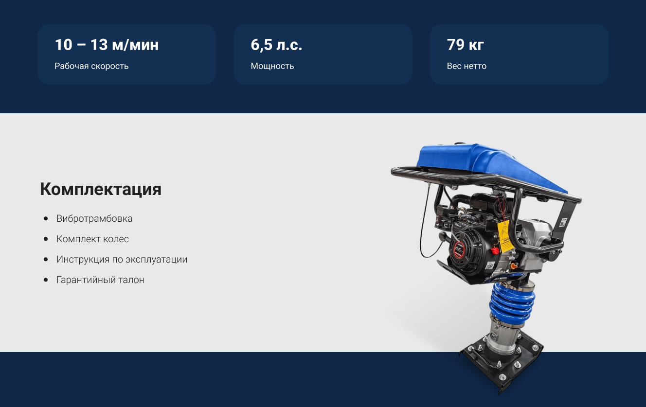 Отличная трамбовка для работы в стеснённых условиях! Особенно удобно использовать в траншеях и возле люков. Мощность 6.5 л.с. хватает с лихвой, а расход топлива всего 1.2 литра в час — экономично. Пластиковый бак не ржавеет, что радует. Основание 340х285 мм — размер оптимальный для точного уплотнения.