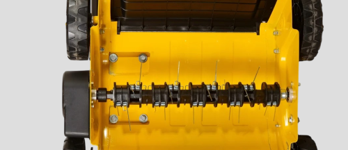 Устройство оснащено 4-тактным одноцилиндровым двигателем с возможностью регулировать частоту вращения до 1600 об./мин. Топливный бак вмещает 3,6 л горючего, объем масла в картере составляет 600 мл. Корпус установлен на шасси с 4 колесами и имеет прочную ручку с антикользящим покрытием. Ширина обработки составляет 420 мл, глубину можно регулировать, выбрав один из 6 возможных уровней (-12/+12 мм). Бензиновый скарификатор-аэратор оснащается 2 сменными валиками с 17 и 26 ножами. С помощью валика для скарификации можно эффективно прочесать газон и собрать с него все нежелательные элементы: мусор, засохшую траву, мох. Все отходы собираются в тканевый травосборник объемом 45 л, который затем можно быстро вытряхнуть. Посредством валика для аэрации выполняется деликатное прорезание плотного грунта, что позволяет улучшить поступление кислорода, питательных веществ, влаги к корням растений.