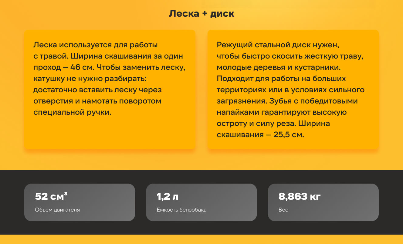 В процессе работы режущий элемент вращается со скоростью 9500±500 об/мин, обеспечивая высокую производительность. Для скашивания травы предусмотрена леска. За один проход она создает полосу шириной 46 см. Катушка «Easy Load» из ударопрочного пластика обеспечивает быструю безразборную заправку лески. Режущий стальной диск 40ТР используется для высокой густой поросли. Ширина скашивания диском составляет 25,5 см.