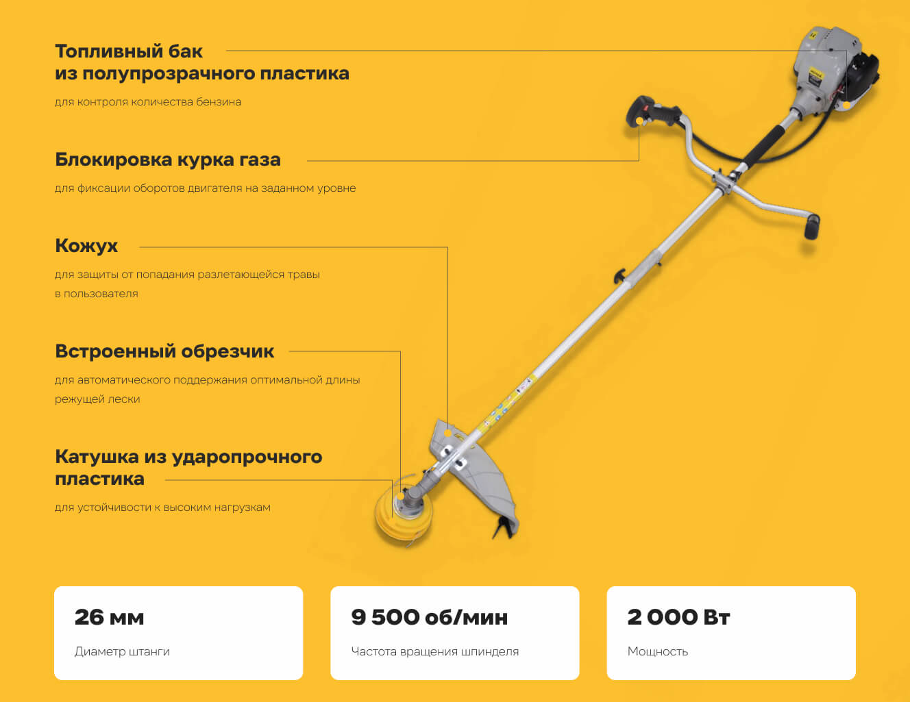 - Защитный кожух Предотвращает попадание разлетающейся травы и веток в оператора