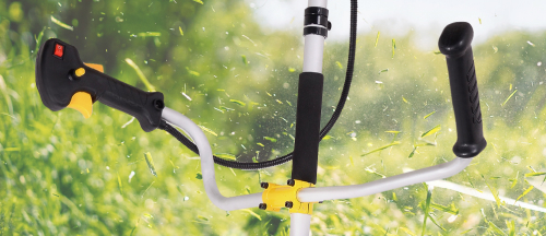 Управление дроссельной заслонкой бензотриммера осуществляется курком, расположенным на его правой рукоятке. Также на рукоятке установлен переключатель остановки двигателя. Для удобства работы, бензиновый триммер укомплектован наплечным ремнем и двумя рукоятками, закрепленными на штанге триммера.