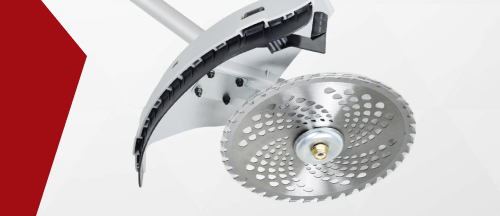 Крутящий момент от двигателя передается на угловой редуктор через центробежное сцепление и жесткий вал, проходящий в прямой неразборной трубчатой штанге. На выходной вал редуктора навешивается режущий инструмент. Данный бензиновый триммер предполагает использование двух видов режущего инструмента: