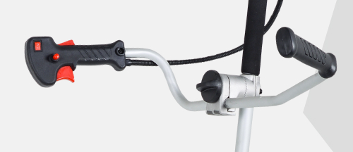 На штанге бензотриммера монтируется рулевая трубчатая скоба с двумя рукоятками, для управления движением режущего узла. На правую рукоятку выведено управление дроссельной заслонкой триммера, с блокировкой от случайного нажатия. Кроме курка «газа», на рукоятке установлен переключатель остановки двигателя.