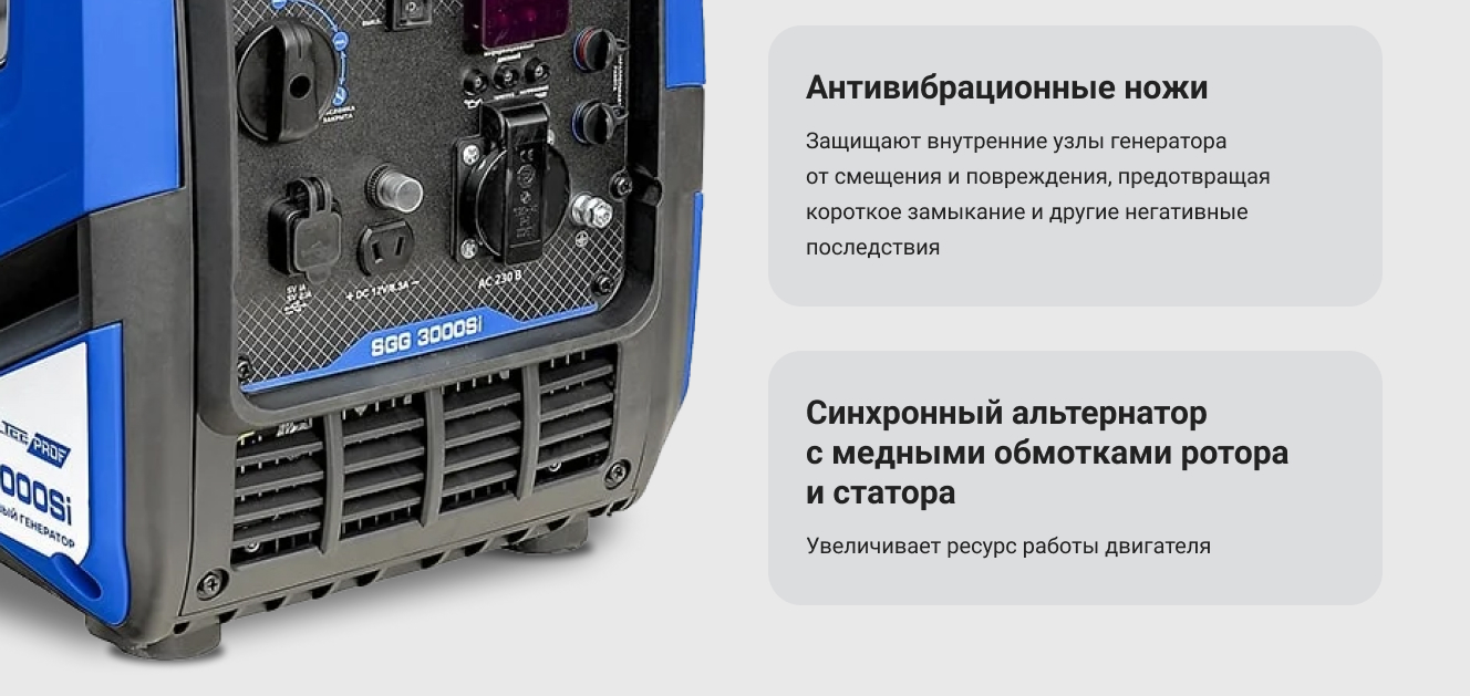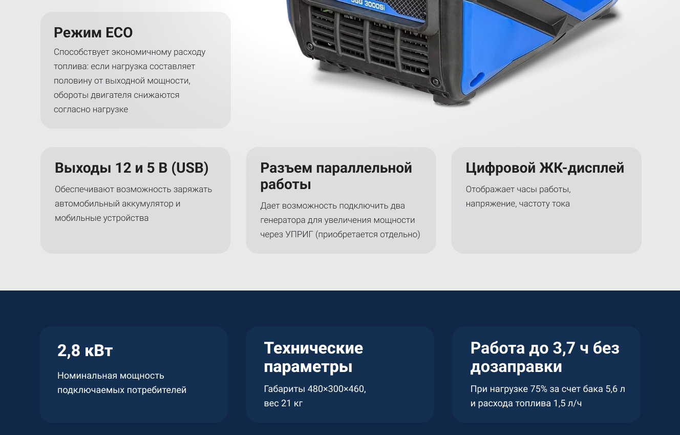 Благодаря двигателю, специально разработанному под инверторный генератор и особенной конструкции корпуса, удалось значительно понизить уровень шума. Режим ECO обеспечивает экономичный расход топлива, синхронный альтернатор с медными обмотками ротора и статора увеличивает ресурс двигателя. Выход 12 вольт позволяет подзарядить автомобильный аккумулятор в экстренном случае.
