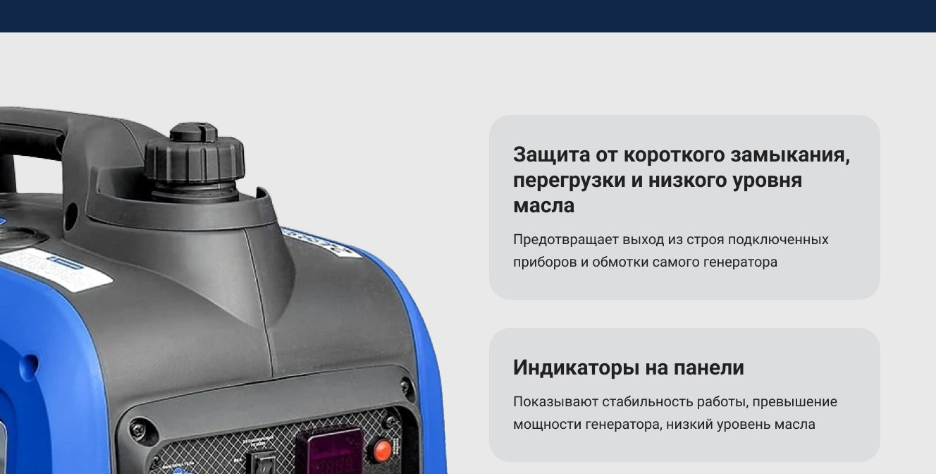 - Защита от короткого замыкания, перегрузки и низкого уровня масла
