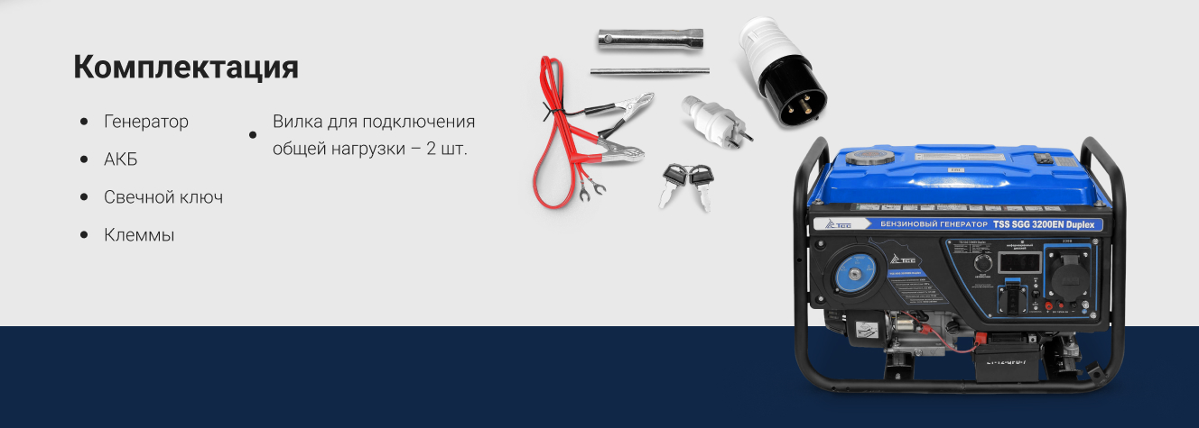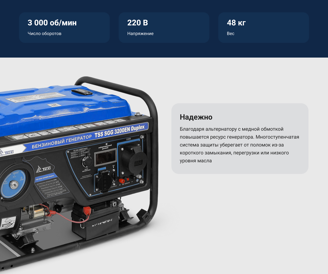 Бензиновый генератор с электростартом TSS SGG 3200EN Duplex при номинальной мощности равной 3,2 кВт, обеспечивает кратковременную пусковую мощность до 6 кВт.