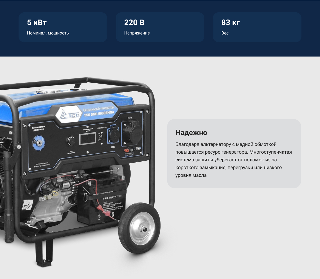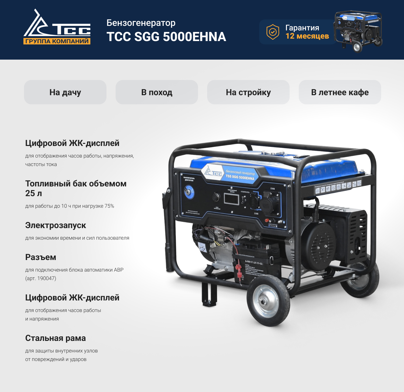 - Бензогенератор ТСС SGG 5000EHNA 160008 отличается долгим сроком службы