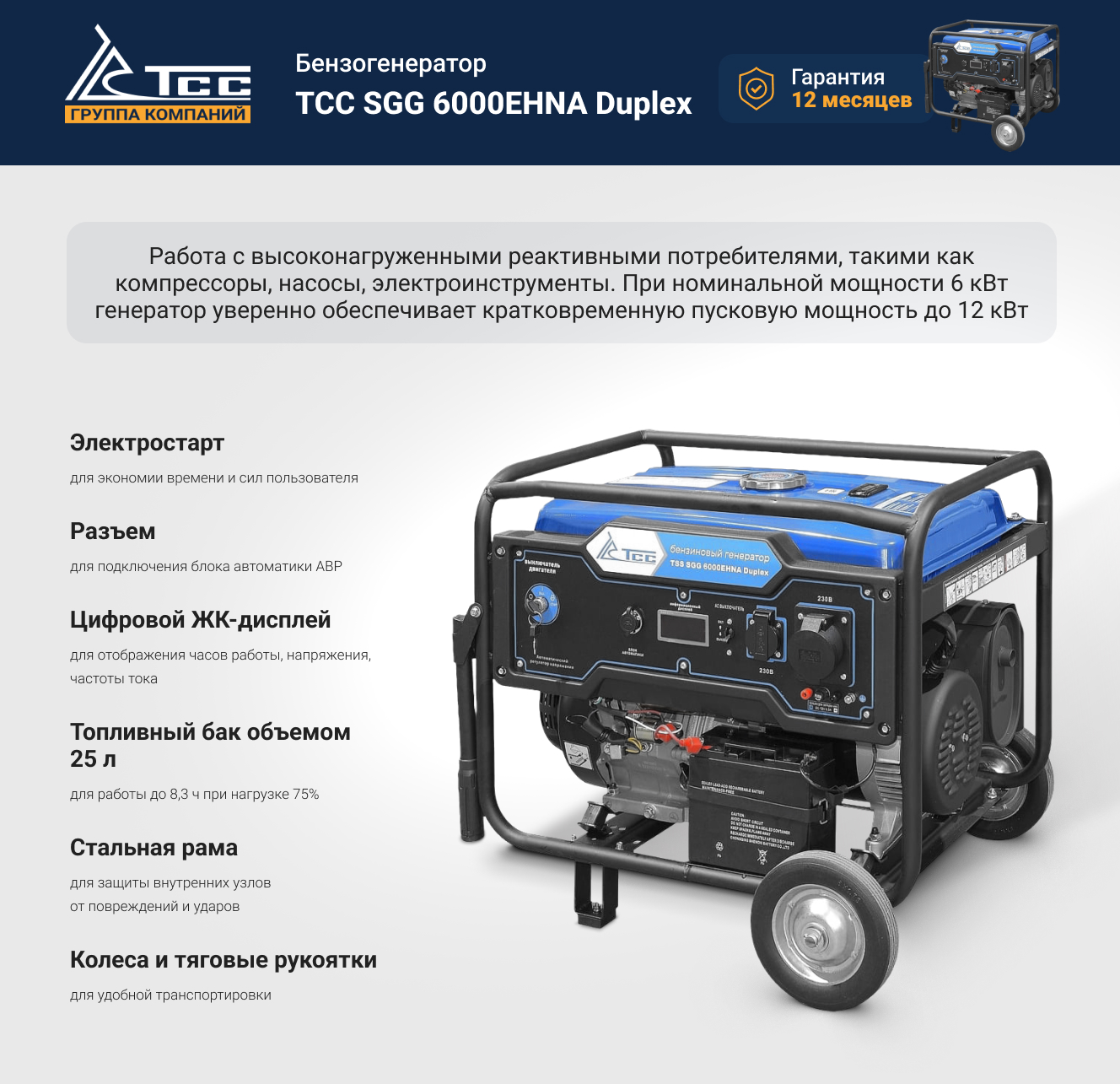 Бензогенератор с электростартером и разъемом для подключения блока автоматики. TSS SGG 6000ENA Duplex при номинальной мощности, равной 6.0 кВт, обеспечивает кратковременную пусковую мощность до 12 кВт (имеются в виду только пусковые токи высоконагруженных потребителей).