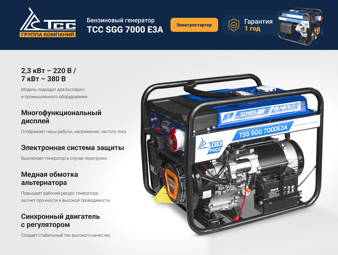 - Бензогенератор ТСС SGG 7000 E3A 030021 оснащен синхронным беcщеточным двигателем с автоматическим регулятором напряжения, обеспечивающим высокий уровень стабильности выходного напряжения и устойчивости к перегрузкам