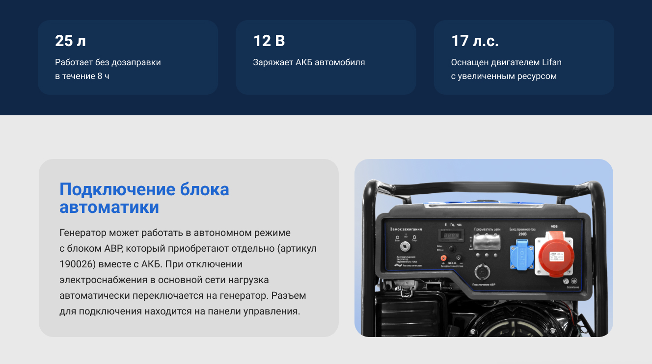 - Электронная система аварийной защиты (контролирует параметры работы станции и, при необходимости, выключит генератор, в том числе по перегрузке или по низкому уровню масла)