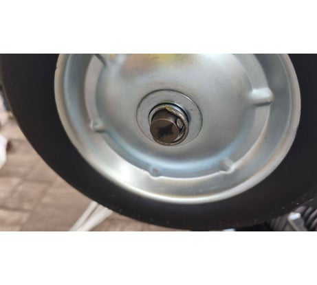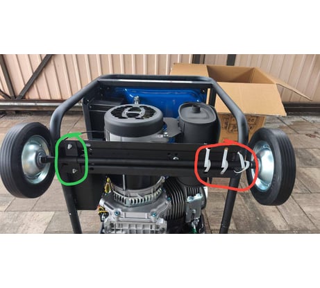 В комплекте не было: передних ножек, крепежа для ручек, шплинтов для фиксации колес на оси, пришлось вставить гвозди и загнуть. На самой колесной оси отсутствовала пластина для крепления оси к корпусу генератора. Пришлось временно зафиксировать на стяжки. Это вообще как? К работе самого генератора вопросов нет.