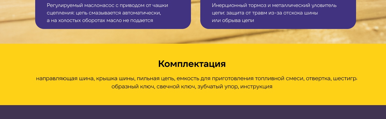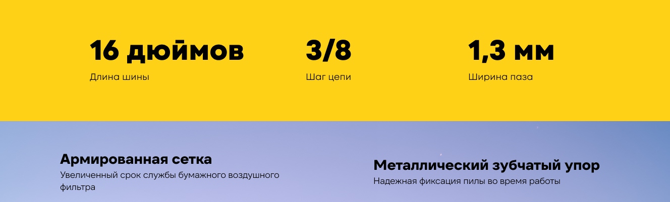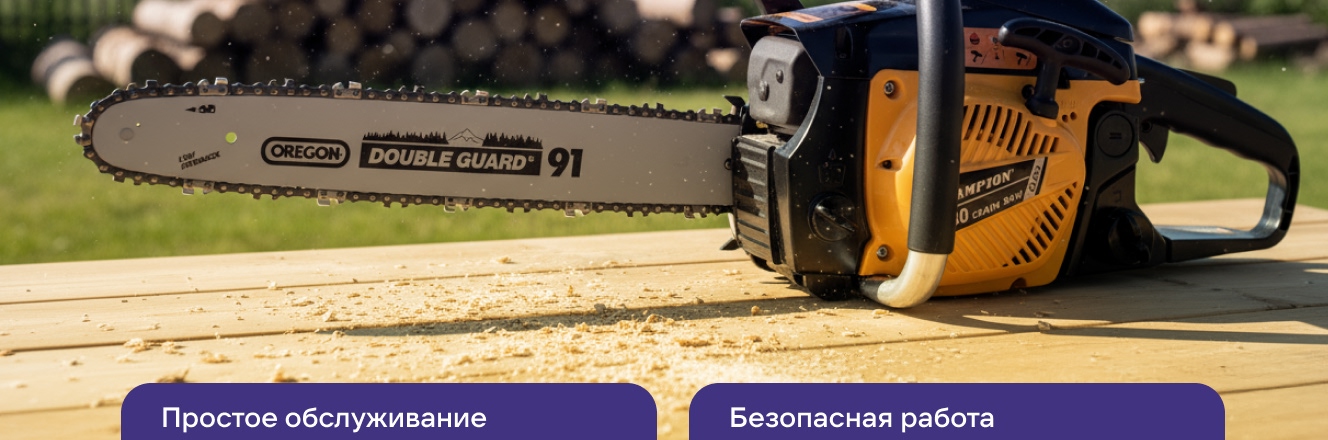 Инструмент оборудован уловителем цепи, рычагом тормоза, цепью с низкой отдачей и блокиратором курка газа, что повышает безопасность использования.
