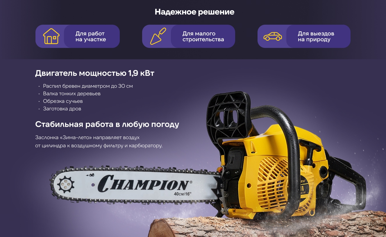 Бензопила CHAMPION 241-16 незаменима при работах по валке деревьев, раскряжевке, обрезке ветвей и распиливания деревянных заготовок.