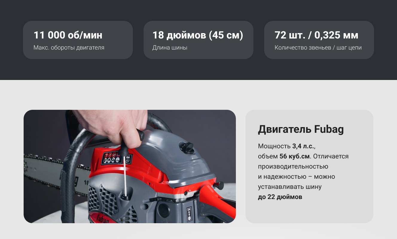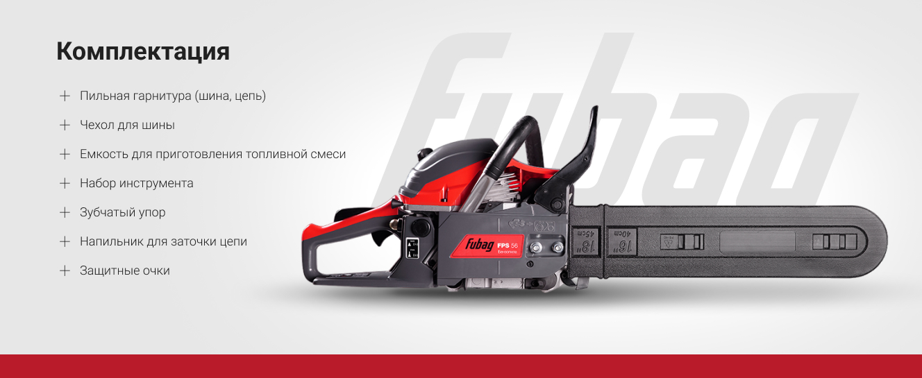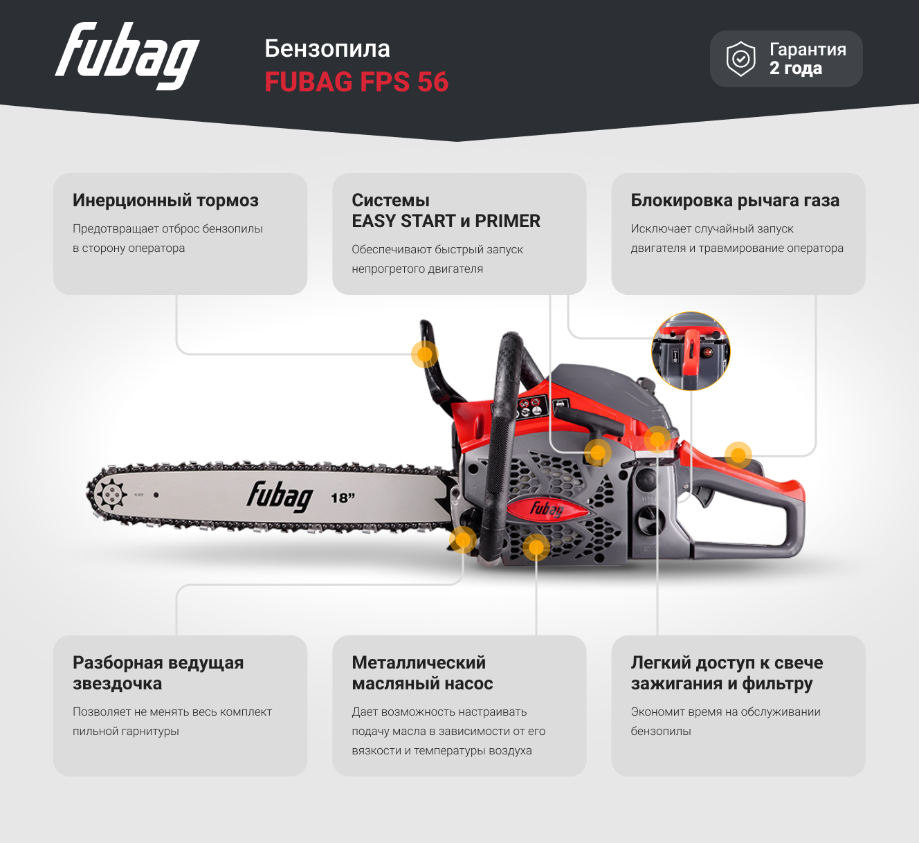 Бензопила FUBAG FPS 56 38707 предназначена для частого и длительного использования в лесной, строительной и коммунальной отраслях благодаря мощному двигателю с увеличенным рабочим ресурсом. Система быстрой натяжки цепи и разборная ведущая звездочка повышают удобство эксплуатации и обеспечивают быструю замену пильной гарнитуры. Для легкого и быстрого запуска непрогретого инструмента предусмотрены функции Easy Start и Primer.