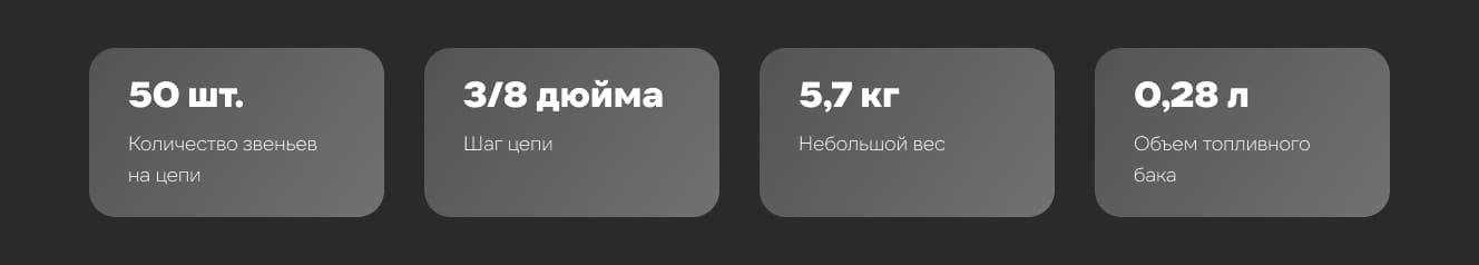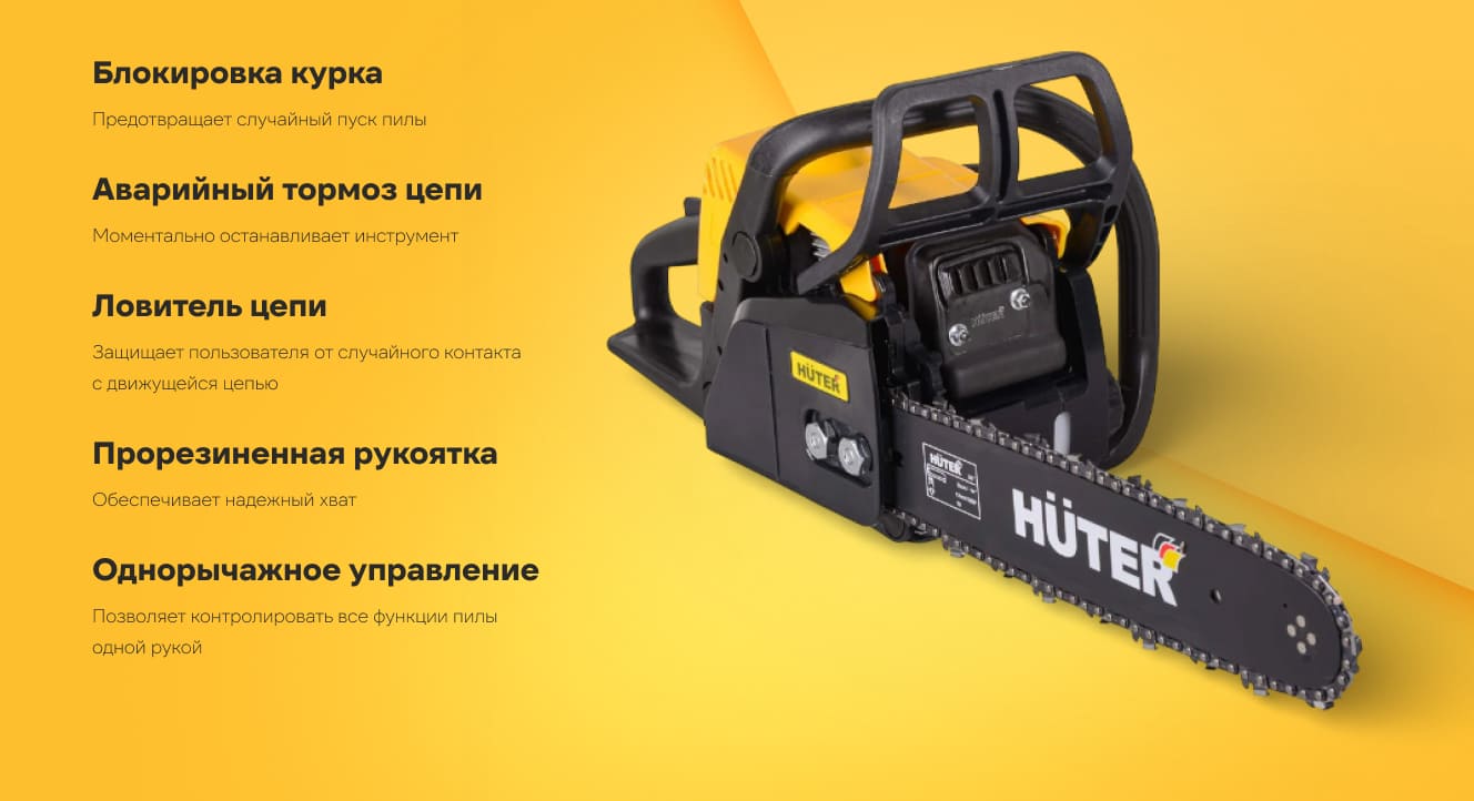 Хорошее соотношение мощности и веса, долговечность заточки цепи, безопасность, надежность механизма тормоза.