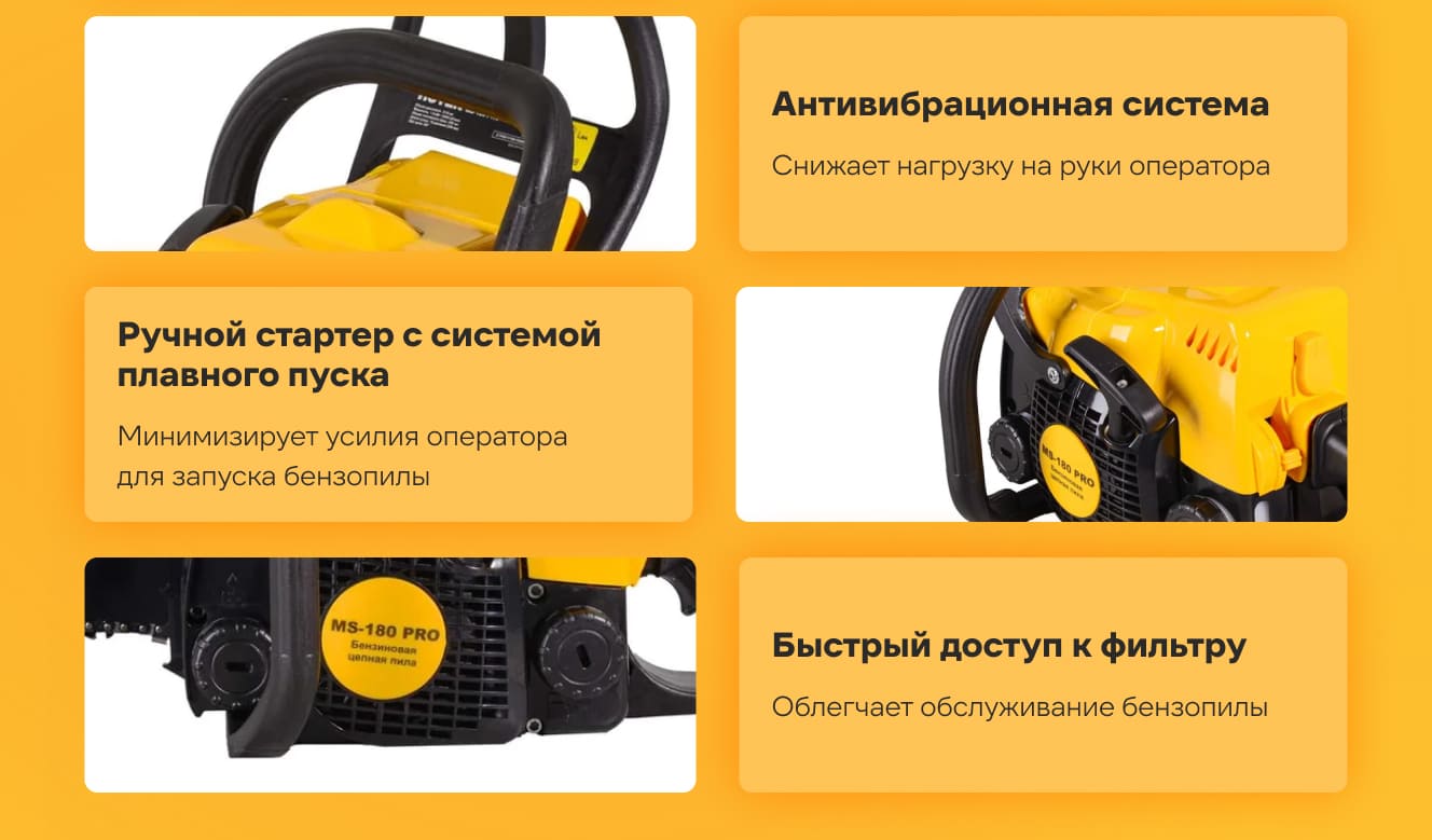 Бензопила MS-180 PRO Huter предназначена для выполнения различных работ по дереву: распиловки вдоль и поперёк волокон, повала деревьев, обрезки сучьев, заготовки топливной древесины и других операций по обработке древесины. Двигатель двухтактного типа развивает мощность 1,5 кВт и гарантирует стабильную работу инструмента в различных режимах эксплуатации. Его объем составляет 31,8 см³. Он работает на смеси бензина и специального масла для 2Т двигателей. Объем топливного бака составляет 280 мл, что позволяет длительное время работать без дозаправки. Толщина звена 1,3 мм и шаг цепи 3/8" обеспечивают оптимальное сочетание скорости резания и плавности хода. Длина шины 350 мм (14") позволяет эффективно пилить стволы небольшого и среднего размера и ветки. В процессе работы цепь автоматически смазывается маслом из отдельного резервуара ёмкостью 145 мл. Это существенно увеличивает ресурс работы инструмента, защищая его от перегрева и преждевременного износа. Запуск двигателя становится простым благодаря ручному стартеру с системой плавного пуска. Для комфортной длительной работы предусмотрена антивибрационная система, которая существенно снижает нагрузку на руки оператора. Безопасность обеспечивает мгновенный тормоз цепи, срабатывающий при её отскоке в сторону пользователя.