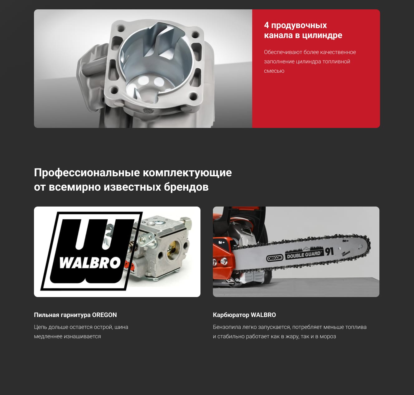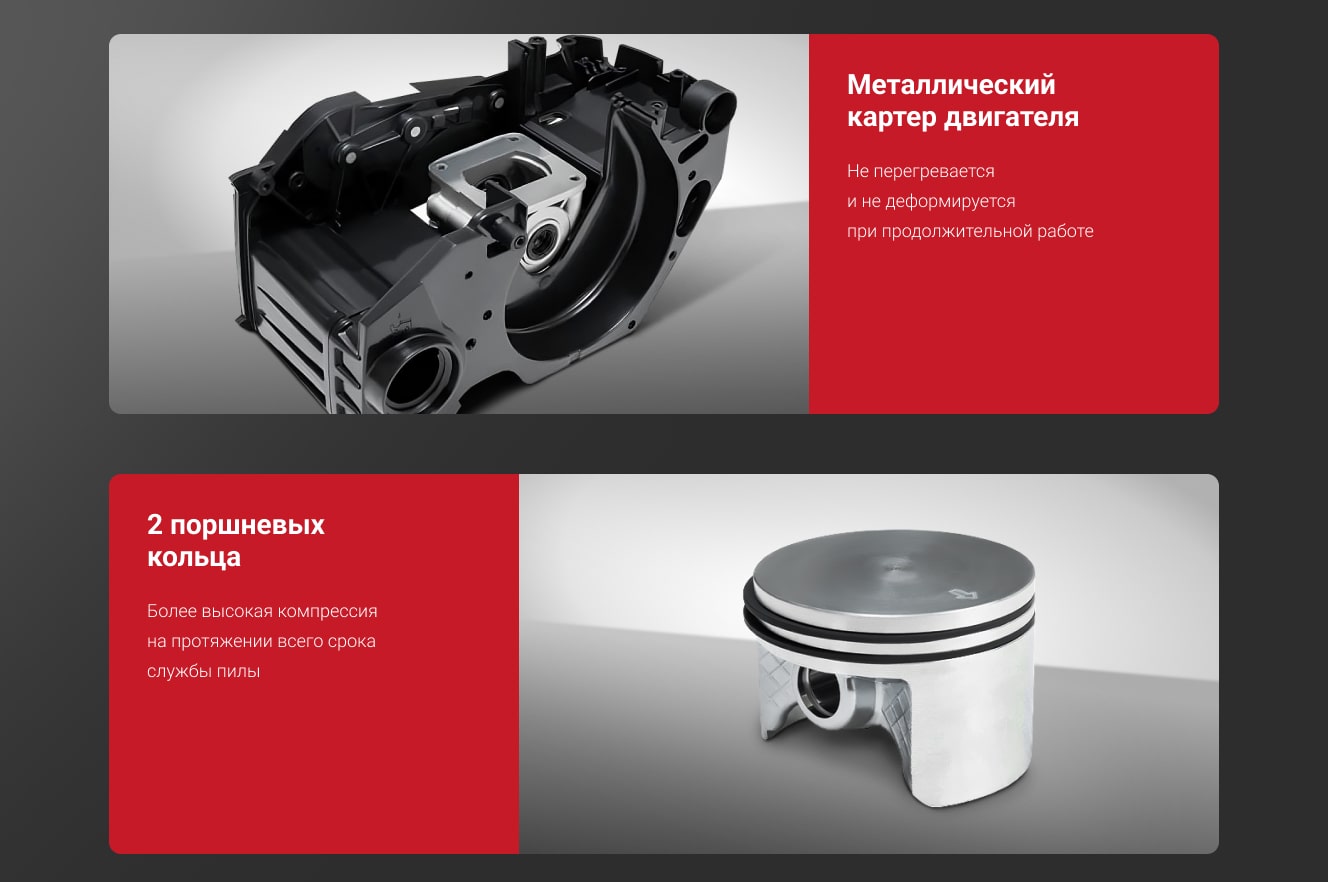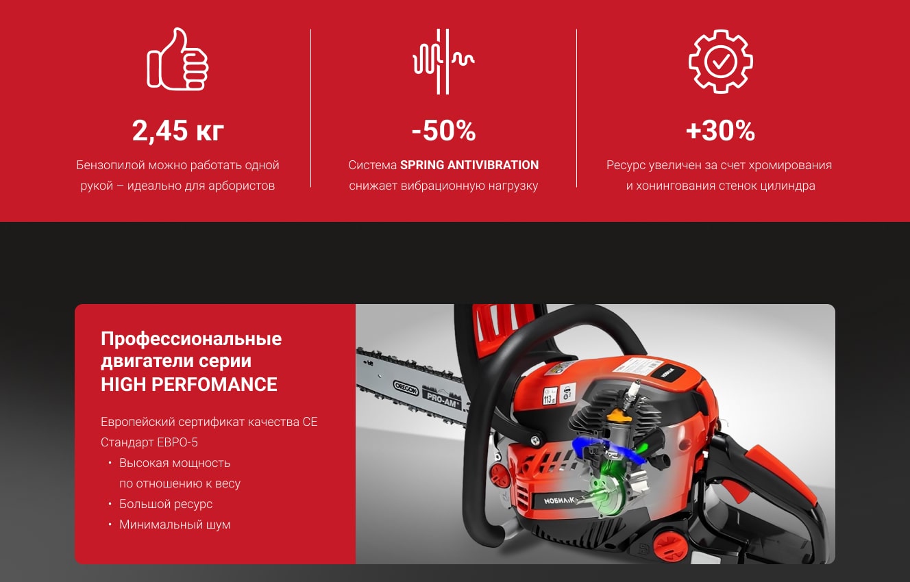 Заводится крайне сложно! На холодную - это целое приключение со всеми известными и на ходу придумываемыми нецензурными выраженниями! Да и на горячую нужно постараться не слабо, чтобы завести. А на дереве это очень не удобно! Приходилось упираться в ствол ею и ловить максимально устойчивое положение. Для арбористов по этой причине совершенно не подходит. Очень тугой аварийный тормоз - всё время казалось, вот-вот сломается, так как не всегда есть возможность принятия удобного устойчивого положения, и я не всегда её выключал. Пружинки на муфте сцепления сыпятся одна за другой - каждые два дня по пружинке лопались, хотя работал ею только на деревьях, то есть, нагрузка была небольшой для неё - ветки. Запчастей на неё нет. Ни пружинок, ни муфт сцепления в сборе. Масло для цепи гонит со всех щелей - вся в масле до самых ручек! Масла приходилось заливать больше, чем бензина! И по этой причине вся в налипшей деревянной пыли и опилках - грязная. Даже не понятно издалека, что это у меня в руках за предмет - просто комок грязи. Да и сам я из-за неё не лучше выгляжу. При снятии прижимной крышки, что держит шинку с цепью, открывается и глушитель - весь в налипших промасленных опилках (на фото уже почищенная), что вообще-то чревато и возгоранием. Возгоранием на дереве в лесу в промасленной же одежде!!! Полное разочарование!!! Ведущая шестерня имеет осевое биение - цепь при проворачивании то натягивается чрезмерно, то провисает не позволительно сильно. Выключатель далековато от пальца. Приходилось выключать второй рукой. Хотя приблизив его всего лишь на сантиметр, сделали бы удобное выключение под большой палец рабочей (у меня правой) руки. В итоге поработал ею не полные 4 дня и пружинок в муфте не стало. Поэтому заводилась после этого раза два и всегда с вращением цепи. Потом перестала заводиться вовсе. Регулировка карбюратора, а именно его работы на высоких и низких оборотах, не возможна!!! Регулировочные винты есть. Но в них нет шлицов!!! Не то, чтобы они были плохо продавлены или профрезерованы. Нет. Их совершенно нет!!! Гладкая сверху!!! А в комплекте вложена малюсенькая минусовая отвёрточка. Хочется спросить производителей: ЗАЧЕМ??? И утоплены эти винты максимально глубоко в корпусе. Есть только возможность регулировки холостых оборотов. Там большая отвёртка-ключ подходит. Моё мнение: как инструмент не пригодна к работе. Сдал в ремонт. Отремонтируют - продам за полцены на "вторичке" и забуду этот бренд навсегда! Это наплевательское отношение к своим покупателям со стороны производителя - продавать не испытанное и не доведённое до ума изделие! Не верьте проплаченным отзывам на Ютубе!!! Я поверил. И вот... Крайне не рекомендую!!!