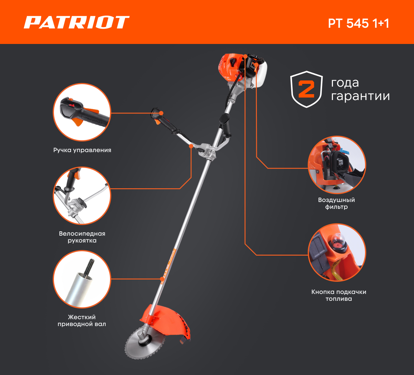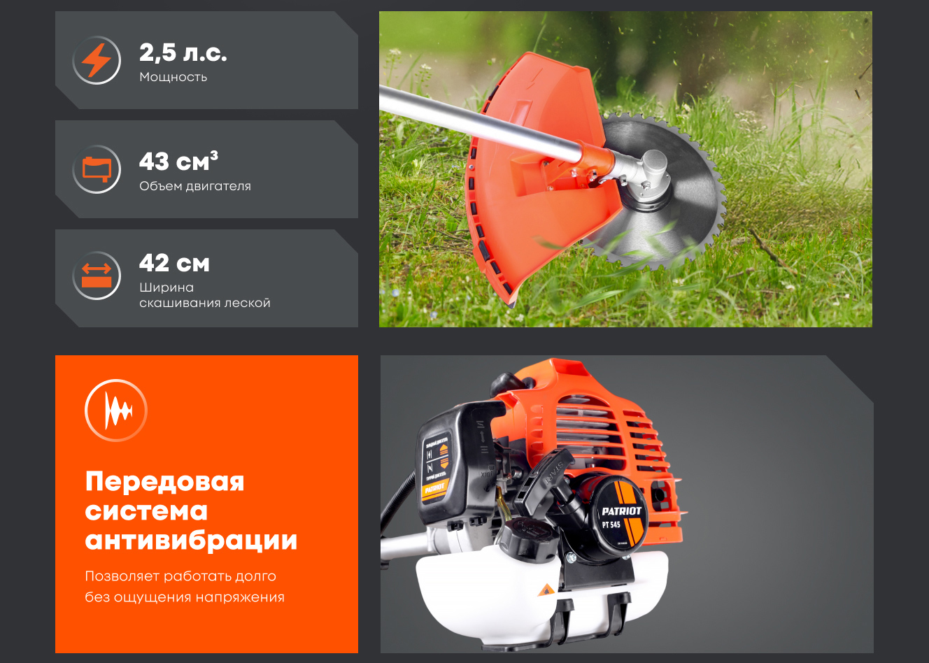 - Центробежное сцепление увеличивает удобство при работе с PATRIOT PT 545 250106220 и уменьшает утомляемость оператора;