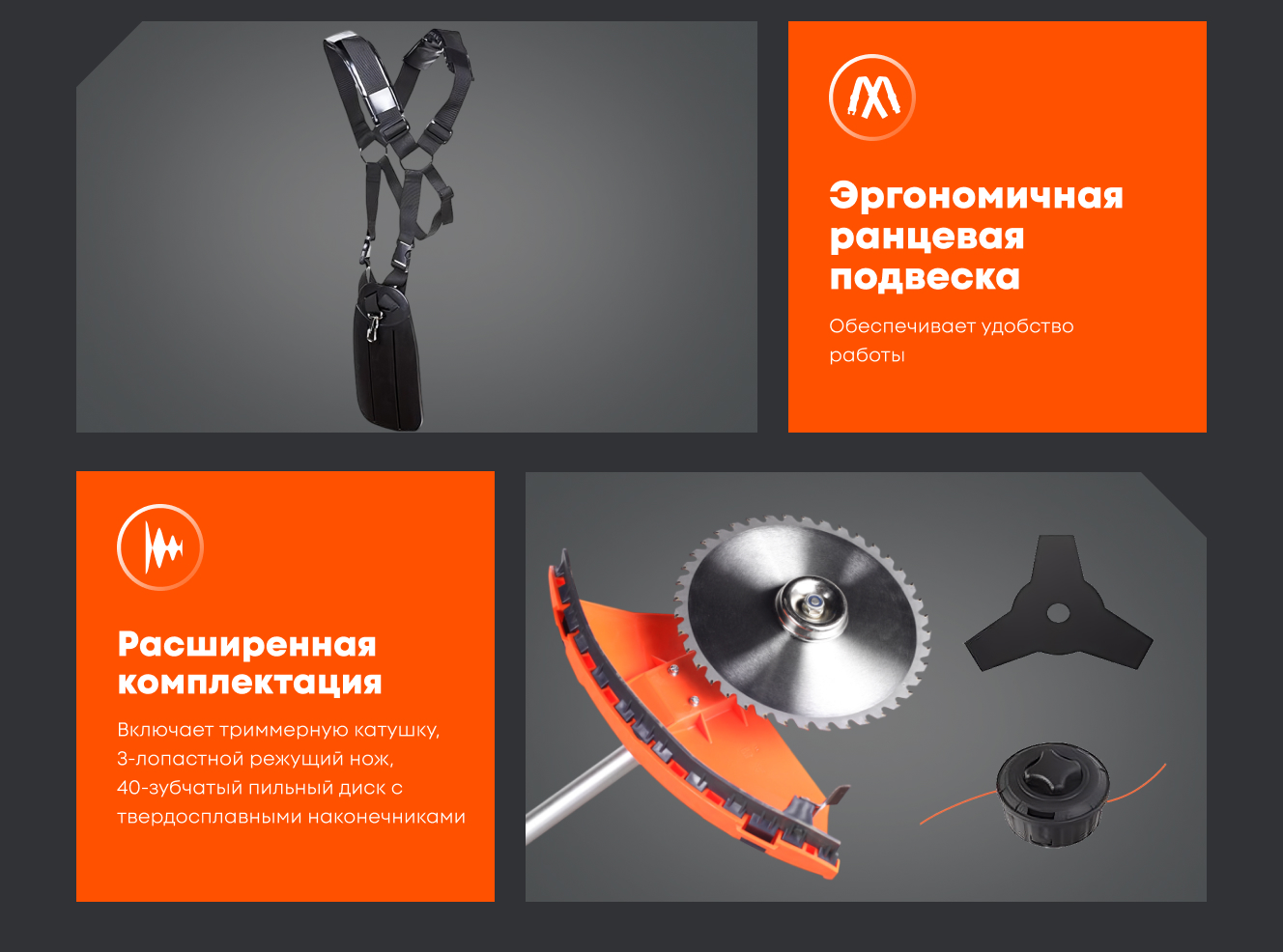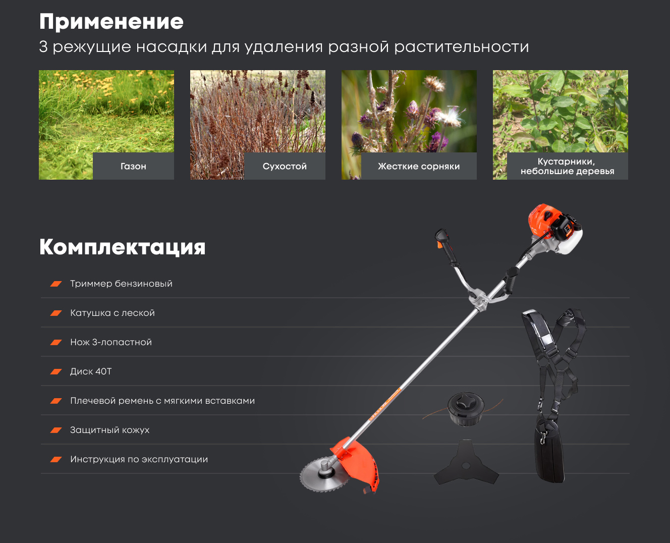 Усиленный жесткий вал. Катушка с леской, нож для травы и пильный диск