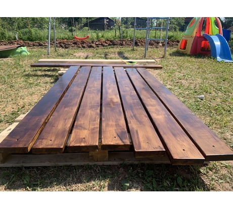 Отдельно покупал толстый поликарбонат,доски шлифовали и красили. Доставил своими силами на крыше легкового автомобиля.