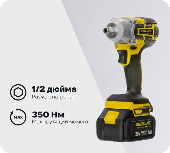Аккумуляторный ударный гайковерт STABILMATIC ONE20MAX DBW-350-PT2 - универсальный инструмент для стройки, гаража, дома, шиномонтажа, предназначен для закручивания/ослабления болтов и гаек, сборки деревянных конструкций, сантехнических и общестроительных работ и оснащен бесщеточным двигателем, что гарантирует долгий срок службы. Для легкого выкручивания крепежа из материала, модель имеет функцию реверса. Новый оптимизированный ударный механизм увеличивает крутящий момент на затягивание до 350 Нм. Металлический корпус редуктора обеспечивает прочность при передаче большого крутящего момента, а ударная функция помогает заворачивать крепеж большого диаметра и отворачивать приржавевшие метизы.